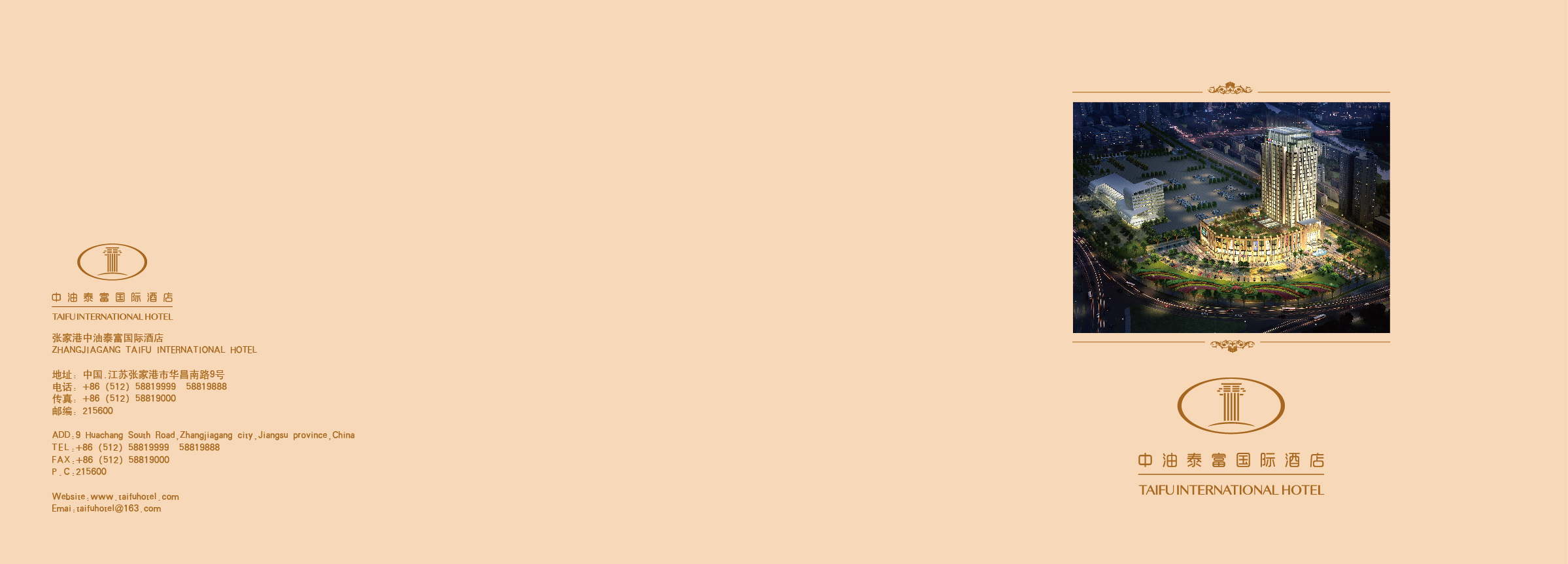 中油泰富国际酒店位于沿海和长江两大经济开发带交汇处的新兴港口工业城市江苏省张家港市华昌南路9号。距离无锡硕放机场,约50公里左右(上海虹桥机场约45分钟路程)距离无锡火车站约40分钟路程、距长途汽车站仅一步之遥,交通位置堪称无双,立体交通便捷天成!酒店距锡张高速,苏虞张高速和沿江公路咫尺之遥。酒店建筑极具特色,外观瑰丽简捷、骄然矗立;内部设施高质完备,倍显尊荣,气度非凡!精致典雅的逾318间/套客房,风格迥异;散发着汉风唐韵及异域风情的各式餐厅、包厢、酒吧镶嵌其中,餐厅中既有供应中西经典菜肴、茶点,可品尝充满文化品位、博大精深之中华丰美菜肴,又可感受地道而源远流长的长江文明与西方文化之浸糅亲和;更有可供千人同时宴会的无梁宴会大厅,独享尊尚、融文化、艺术、神奇、典雅、高贵、清新于其中。细细品味泰富国际大酒店,定能领略海纳百川般的中华文明在绵延、演绎、传承,定能感受到装修极尽豪华之能事、格调饱含暨阳八千年文化积淀之精华、服务更有如切如磋精微之追求、风范彰显君临沙洲之气度!在酒店温馨、祥和、优雅的环境和气氛中,训练有素的员工,随时恭候宾客的光临,并必将不负宾客所期望。“四面人来欲醉,八方宾至如归”。创造舒适、温馨的服务环境是我们的最大理想,客人的褒奖满意就是我们的最高追求!
