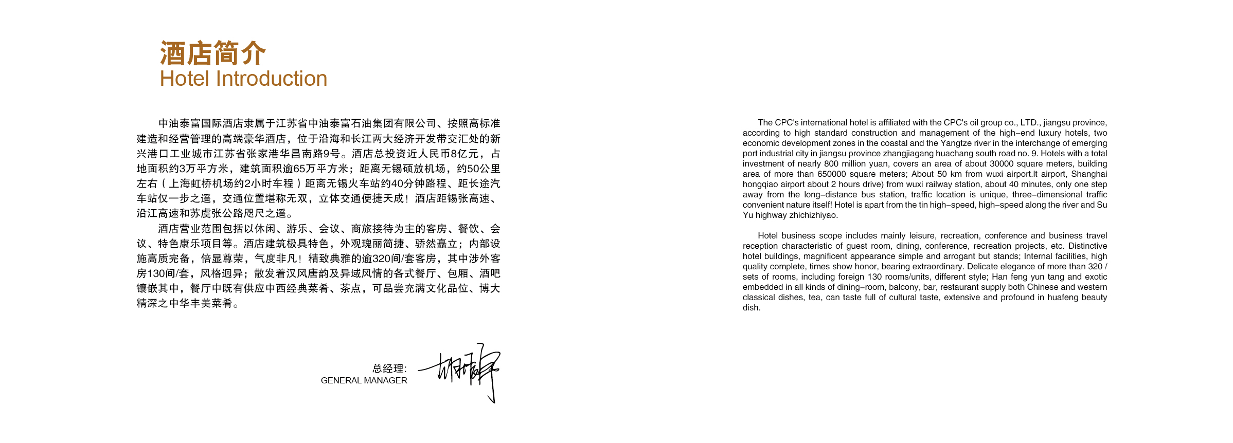 中油泰富国际酒店隶属于江苏省中油泰富石油集团,是一家按照五星级标准建造和经营管理的,集餐饮、客房、会议、休闲娱乐功能为一体的高端豪华酒店,酒店总投资近人民币 8 亿元,占地面积约 1.6万平方米,建筑面积逾 约6.5万平方米;