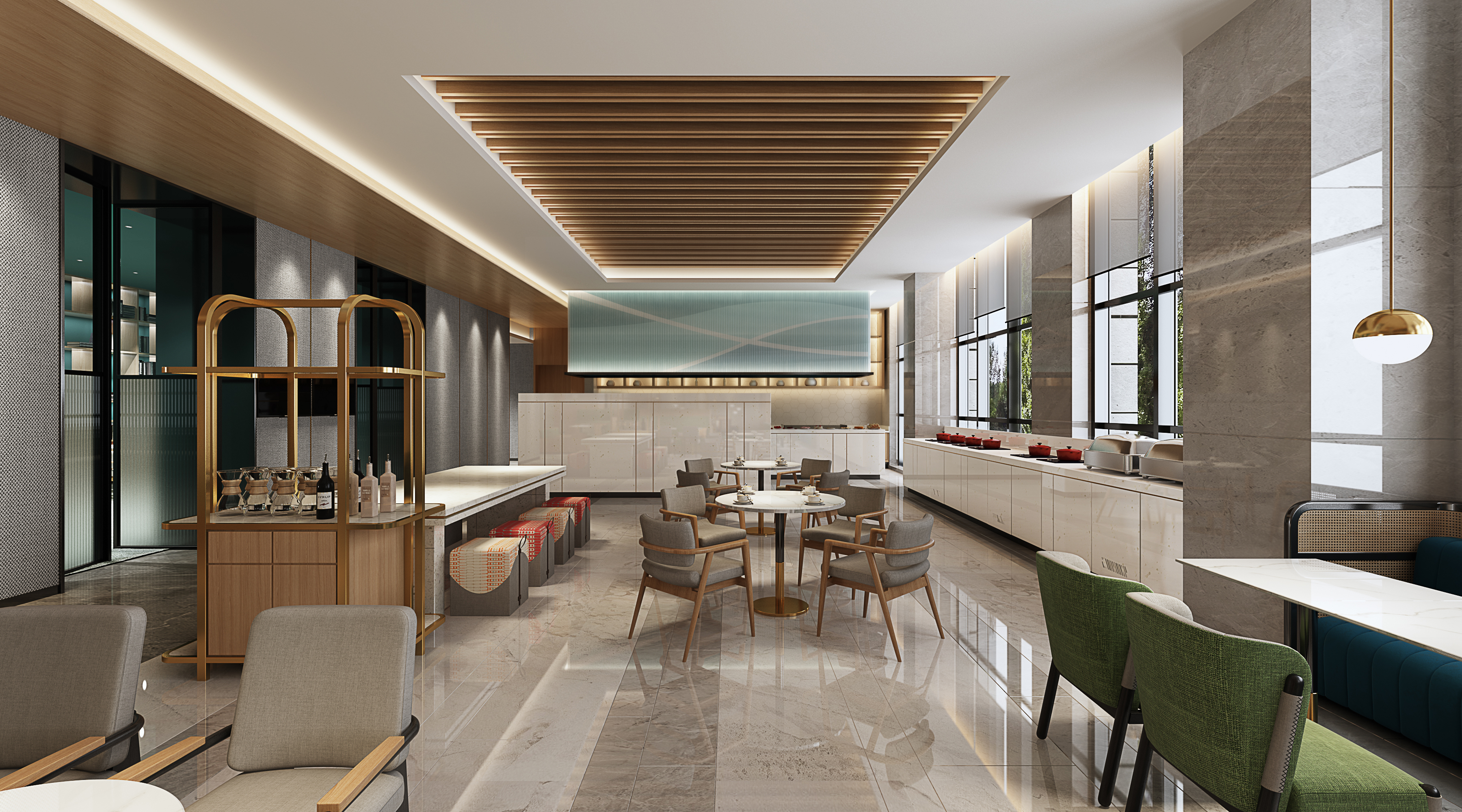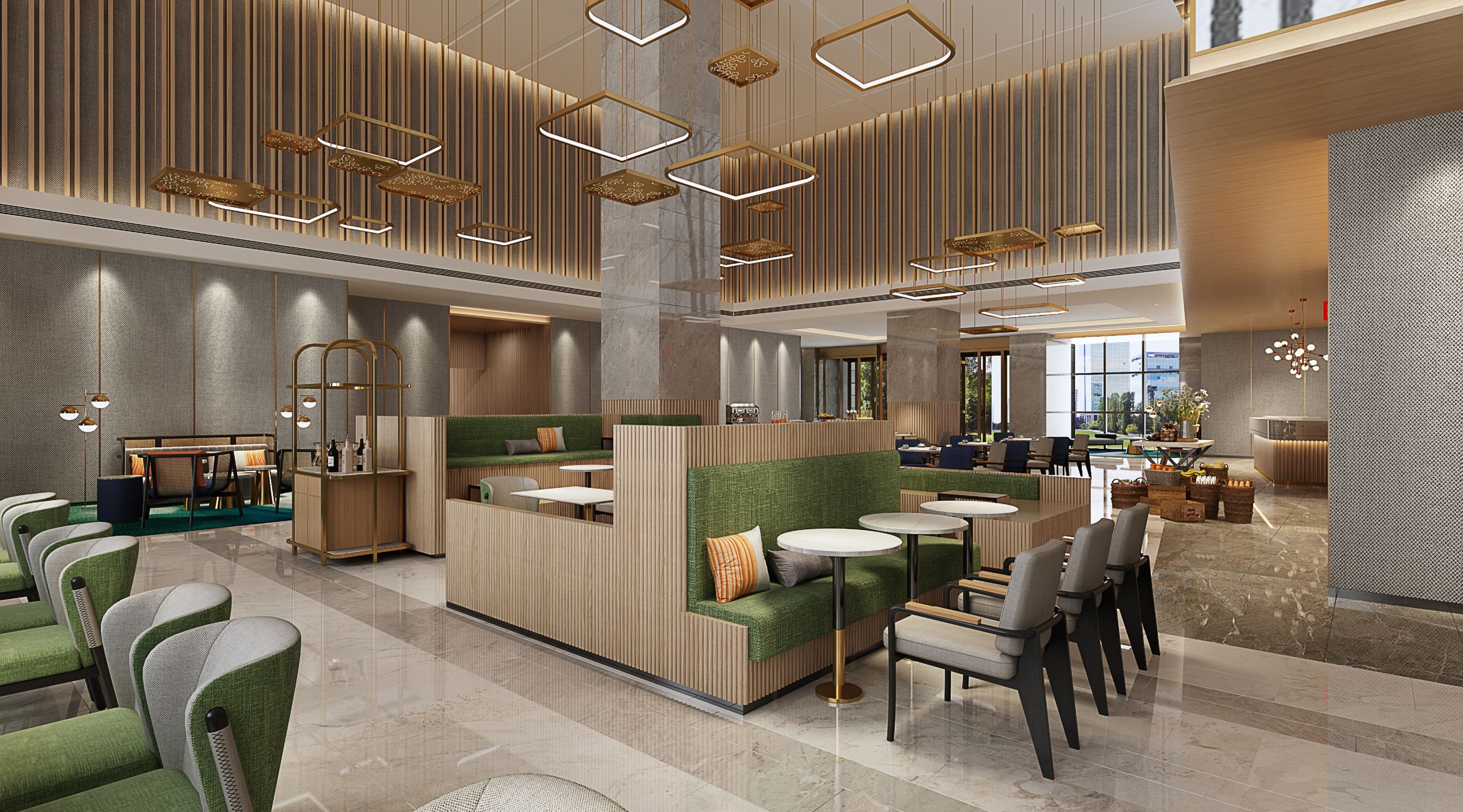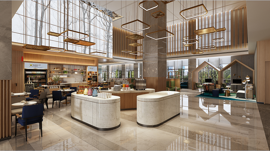 酒店大堂从树木、轮廓场景中提取灵感来源,结合日照市市花桂花作为设计元素,从客人步入酒店的第一声问好开始,享受如在花园园亭之中的明亮、愉悦之感。