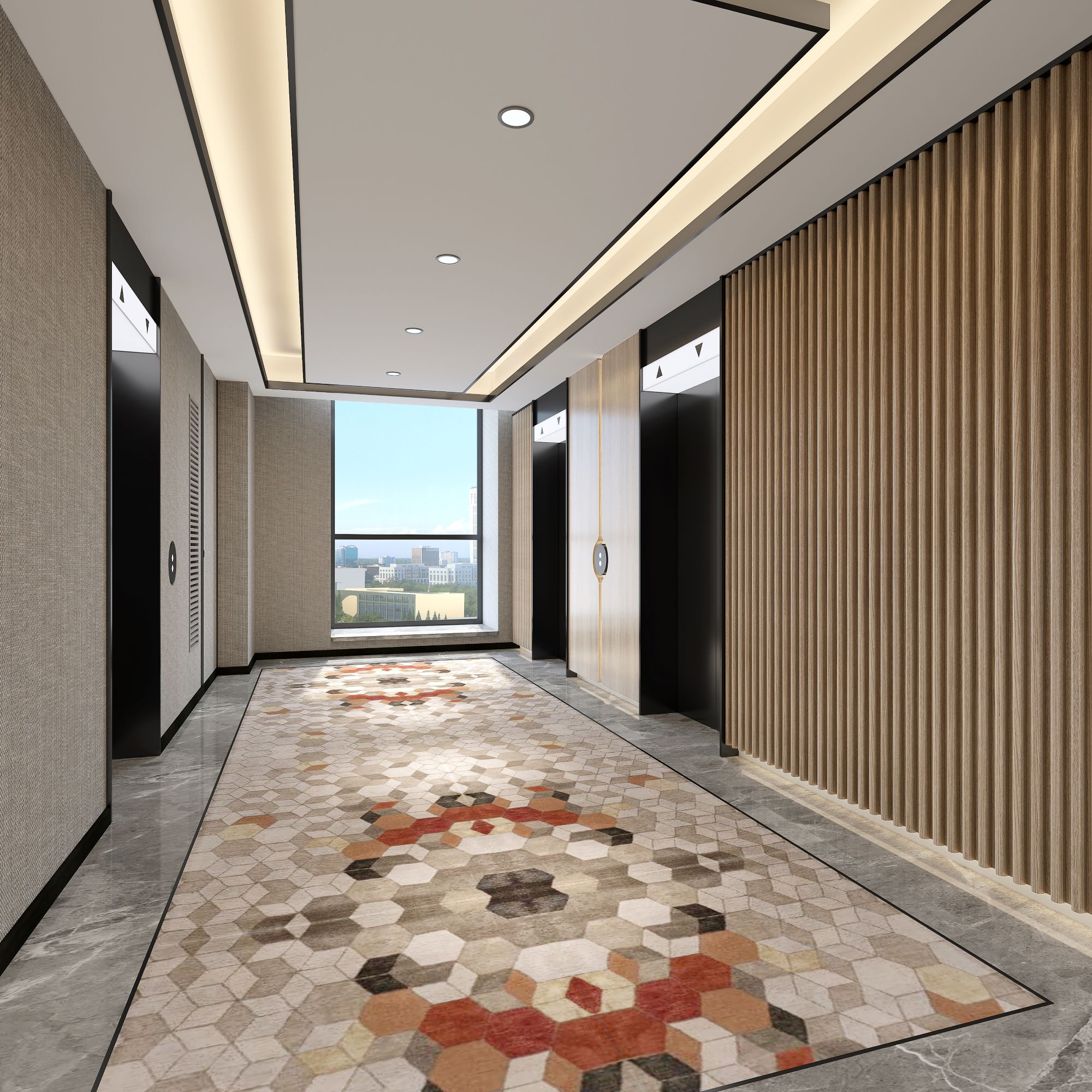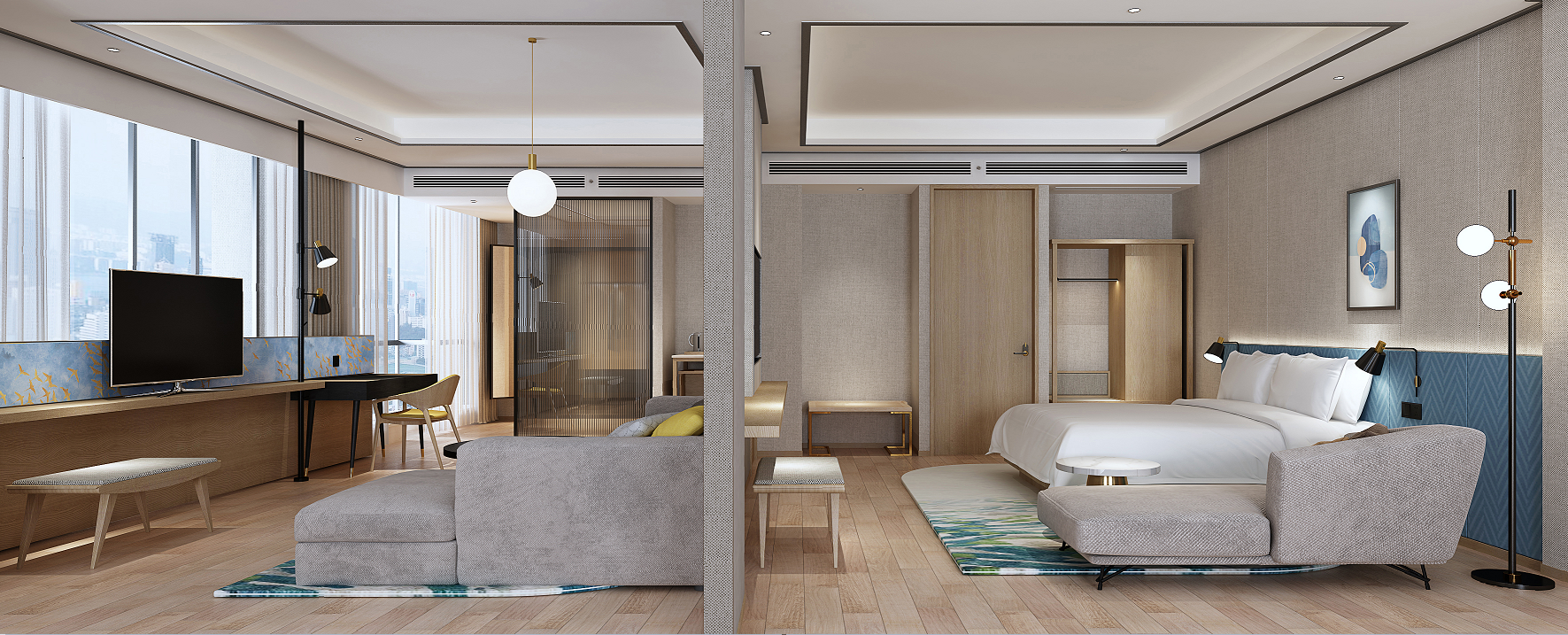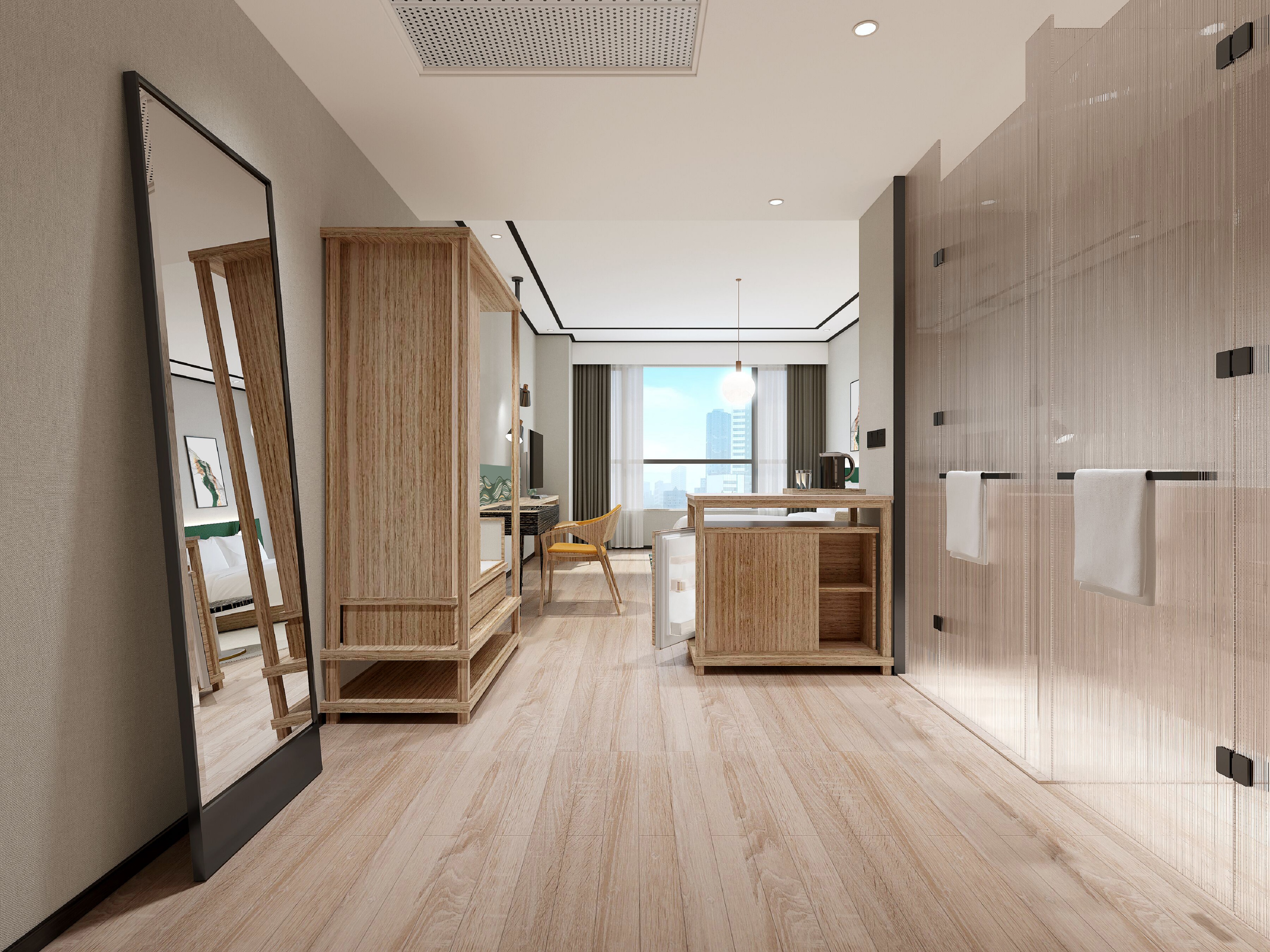 酒店大堂从树木、轮廓场景中提取灵感来源,结合日照市市花桂花作为设计元素,从客人步入酒店的第一声问好开始,享受如在花园园亭之中的明亮、愉悦之感。