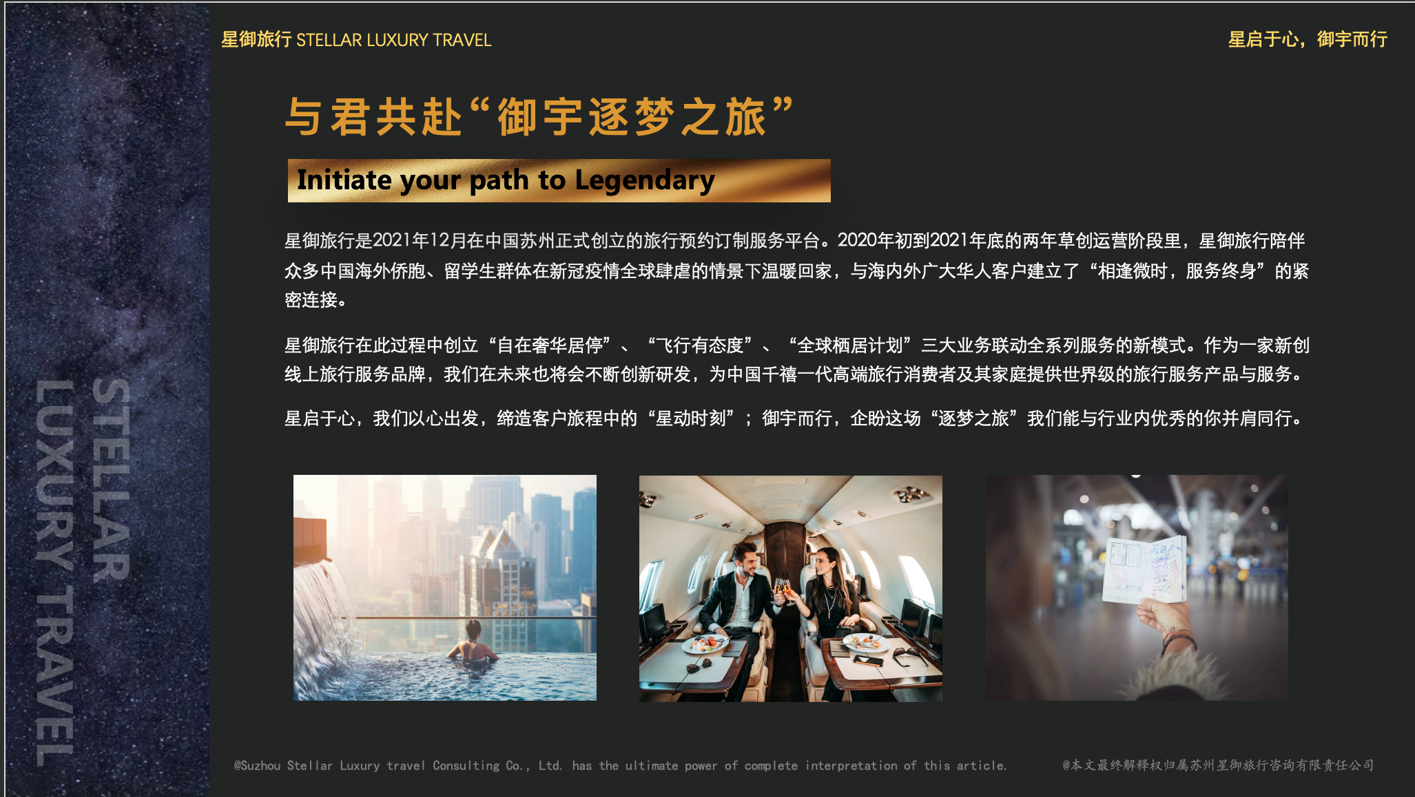 星御旅行在此过程中创立“自在奢华居停”、“飞行有态度”、“全球栖居计划”三大业务联动全系列服务的新模式。作为一家新创线上旅行服务品牌,我们在未来也将会不断创新研发,为中国千禧一代高端旅行消费者及其家庭提供世界级的旅行服务产品与服务。