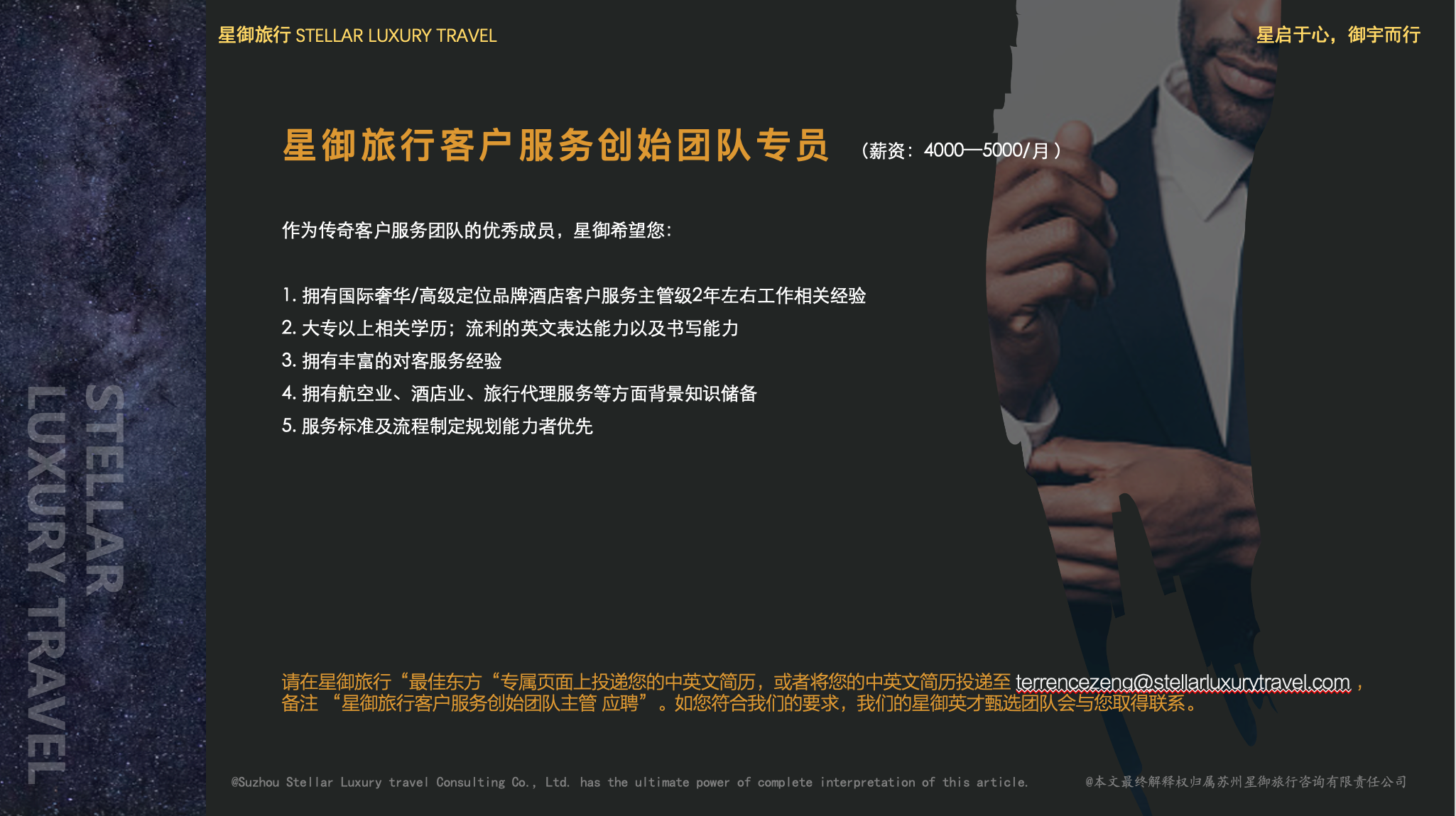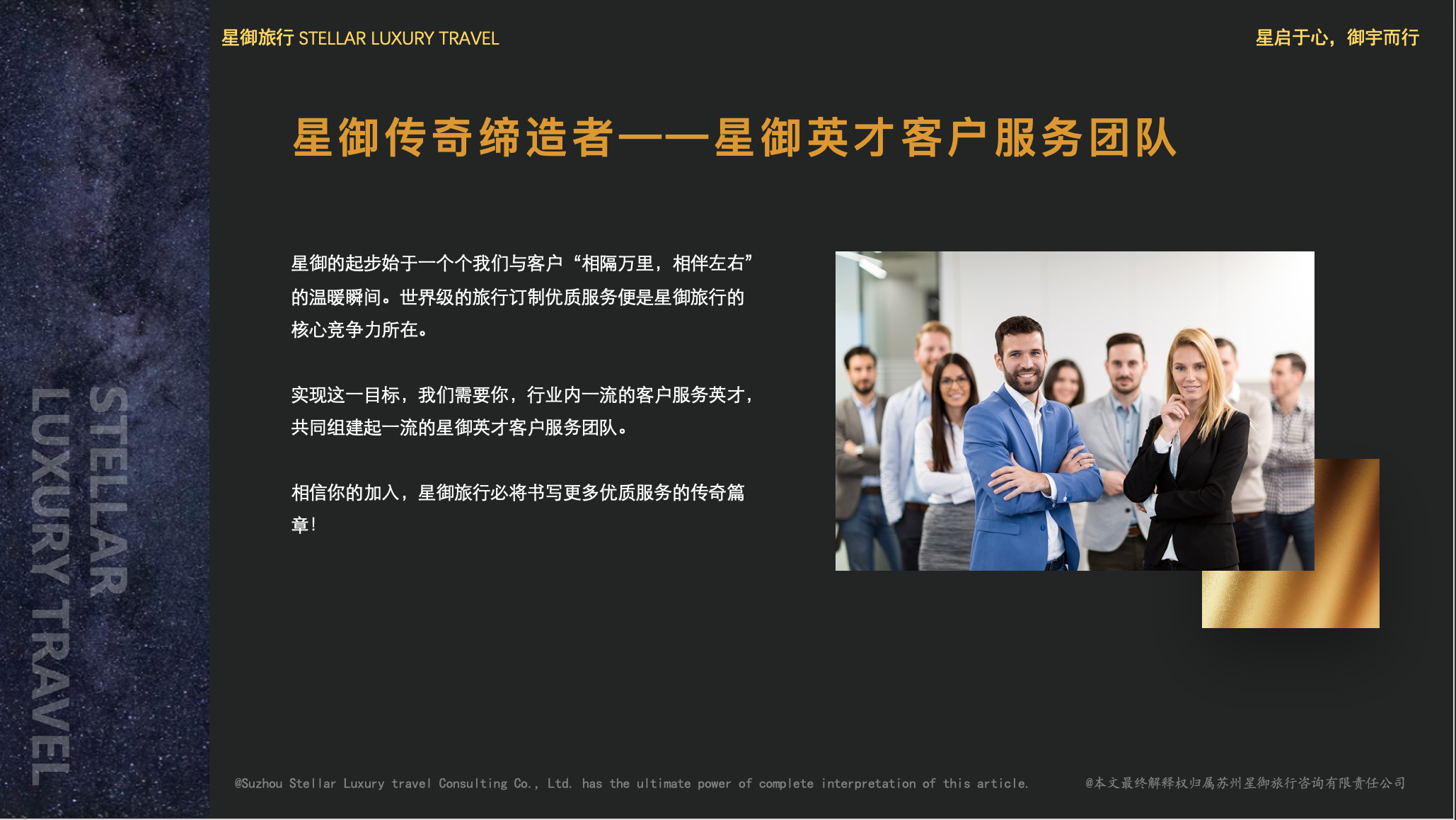 星启于心,我们以心出发,缔造客户旅程中的“星动时刻”;御宇而行,企盼这场“逐梦之旅”我们能与行业内优秀的你并肩同行。