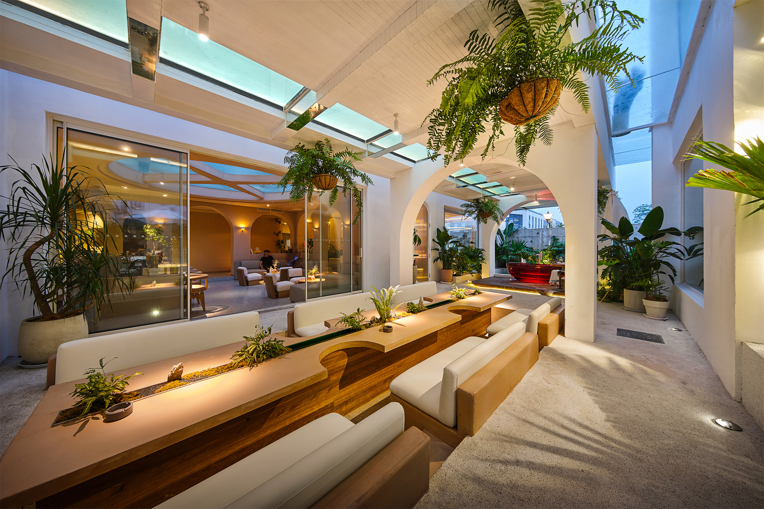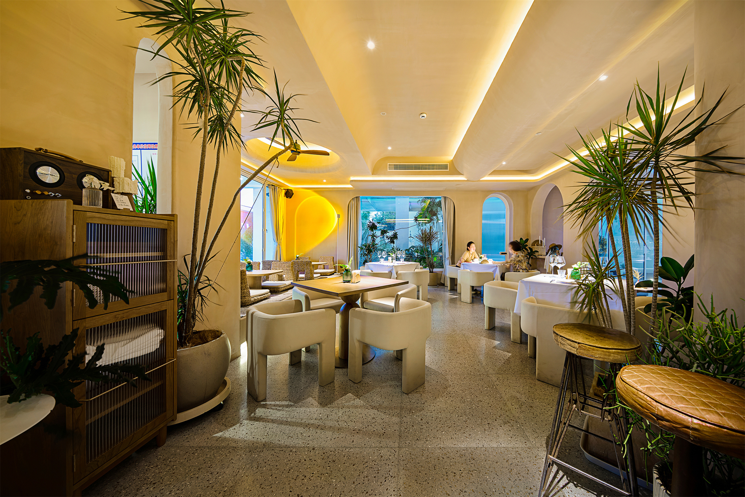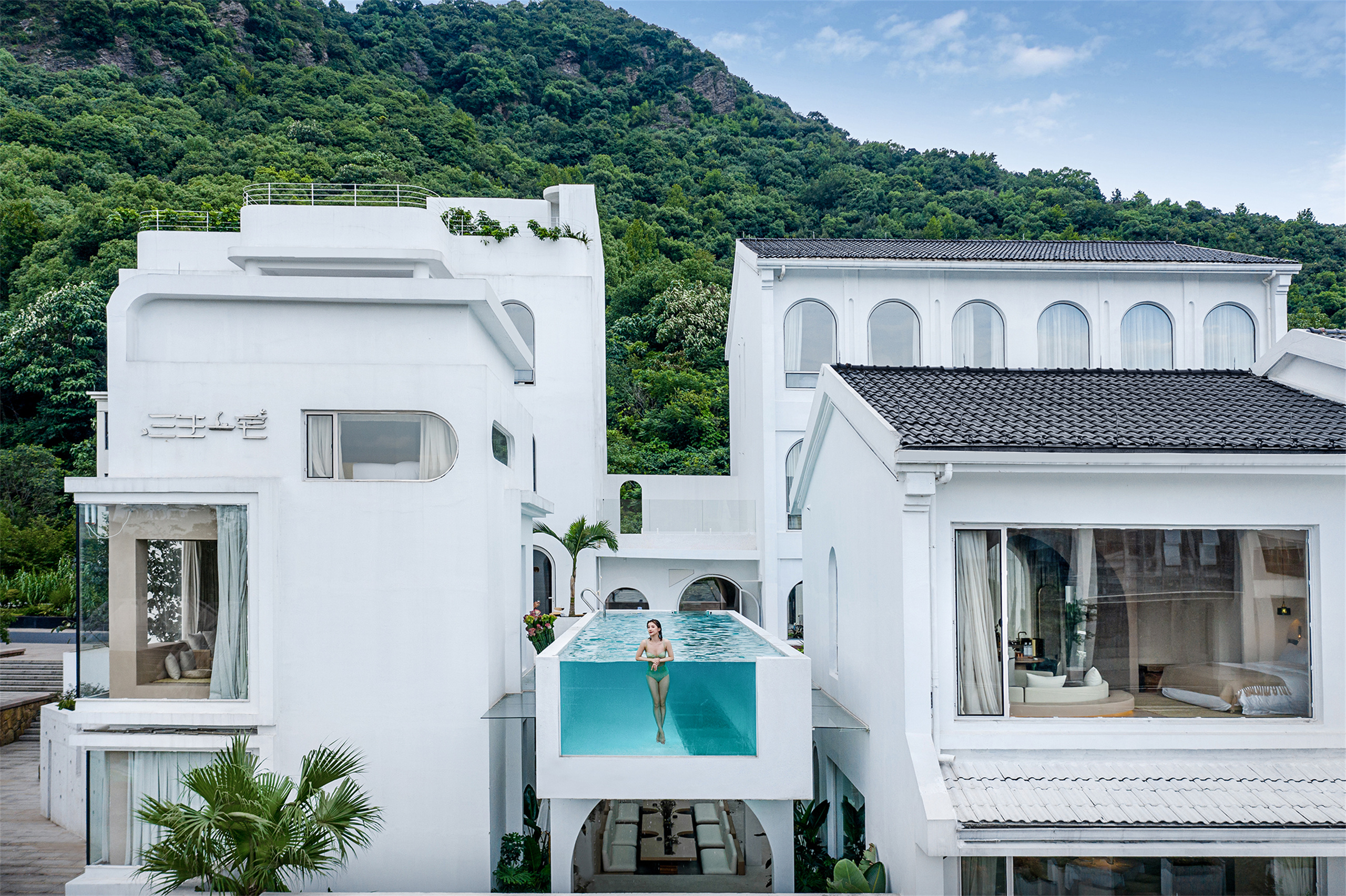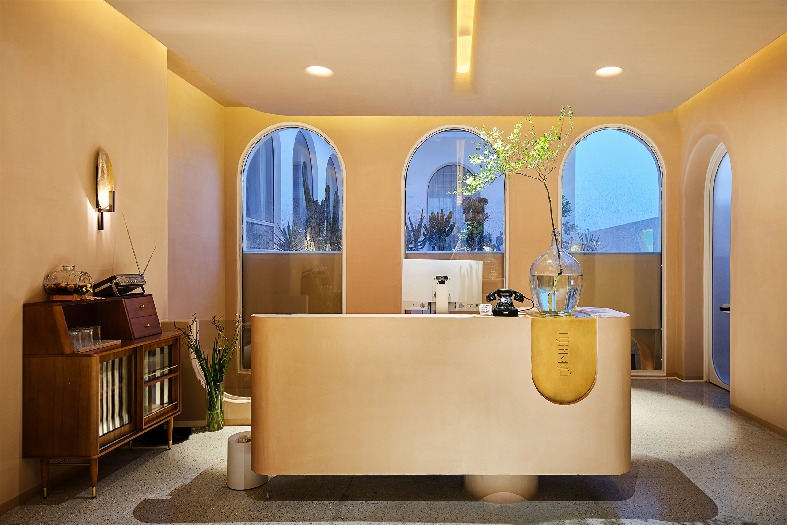 三生一宅民宿杭州湘湖店是品牌在杭城的第二个项目(第一个在桐庐),于2021年5月正式在湘湖水畔亮相。建筑风格一改一期老宅木结构的风格,以全白墙面、圆拱门窗通道、沙粉色微水泥的异域风情呈现,让你在烟雨江南“湘”遇圣托里尼,巧妙地诠释了“三生一宅”从前世到未来的一种延续感,,体会老宅檐下守清梦,湘湖水畔话三生的意境。 民宿定位中高端精品民宿市场,配备有15间客房,一家西餐厅,一家咖啡吧兼酒吧。