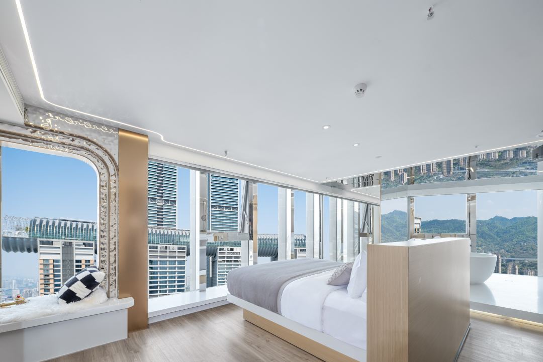 重庆Indition英迪逊高空酒店紧邻重庆地标建筑来福士广场仅50米,所有房间内超宽幅全落地窗,坐拥城市景观和重庆独有的江河景观。 酒店位于地铁1号线朝天门站楼上,来福士广场旁,距离解放碑,洪崖洞,长江索道步行约10分钟,距离穿楼轻轨,南山一棵树光景台,南滨路,北滨路等热门景点均在15分钟车程内。 酒店部分客房拥有临窗透明泡池和恒温无边泳池,可泡在其中俯瞰重庆市中心夜景。客房配备智能声控客房系统,极米H3投影仪,100寸超大幕布,智能马桶,迷你吧,洗衣机等设施设备。床品均采用头等舱芝华士棉品,洗护用品采用奢华品牌APPELLES。酒店为每个入住客人提供全方位24小时1对1管家式服务、6S严苛卫生标准,同时酒店还提供免费寄送行李至机场、火车站等服务,让您轻松出行。