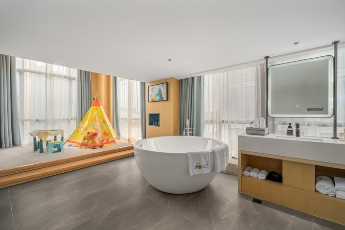 【欢乐家庭房 墅式体验】独具匠心推出复式结构家庭房,仿若迷你别墅,实现动静分离与私密独立,营造专属尊贵感。此房型为酒店亮点设计,尤为适合亲子家庭或追求空间感的宾客。上下两层各置一张大床,可容纳三至四人温馨入住,让家庭旅程享有前所未有的空间尺度与私密体验。