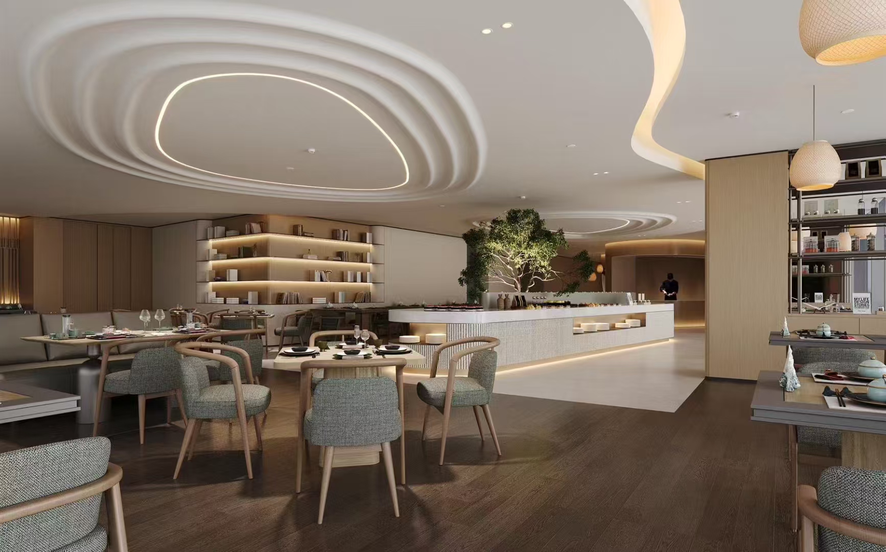 四层欢味餐厅,设计灵感取自“竹喧归浣女”的诗画意境,为宾客营造出一处远离尘嚣的用餐雅境。餐厅面积300余平米,可同时接待80人用餐,为宾客提供各种丰盛营养早餐、特色自助美食等。