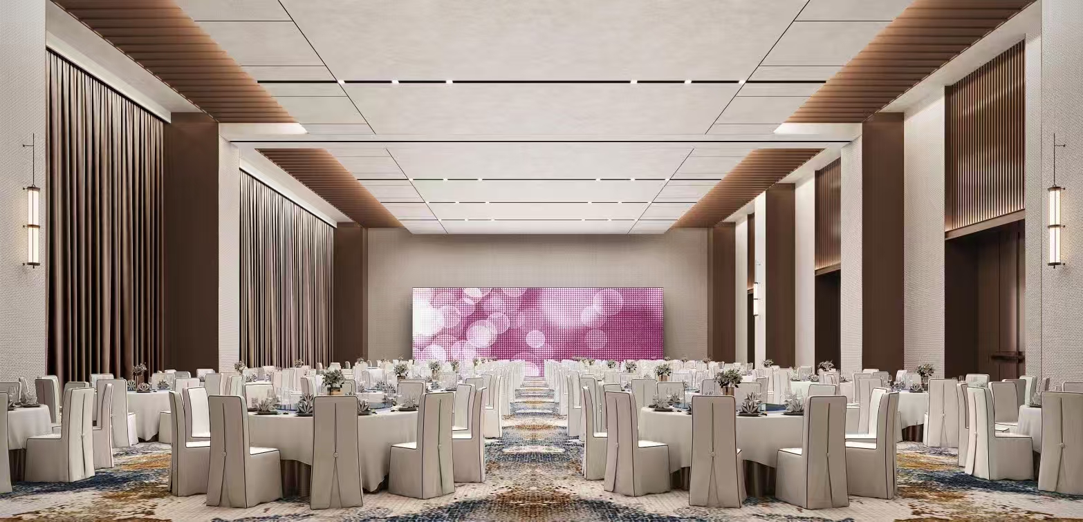 三层设有600平方米无柱式多功能宴会厅,挑高8米,配备高清LED大屏与专业音响系统,可容纳300人,适用于大型年会、公司晚宴、婚宴等多种活动。宴会厅外配套VIP室与新娘房,满足会议与婚宴客户的精细需求。其隔断设计还可将大厅灵活分隔为250平方米与350平方米两个空间,适用于茶话会、座谈会、董事会、培训会等各类会议,以及寿宴、满月宴、谢师宴等多元宴席,极具适应性与实用性。