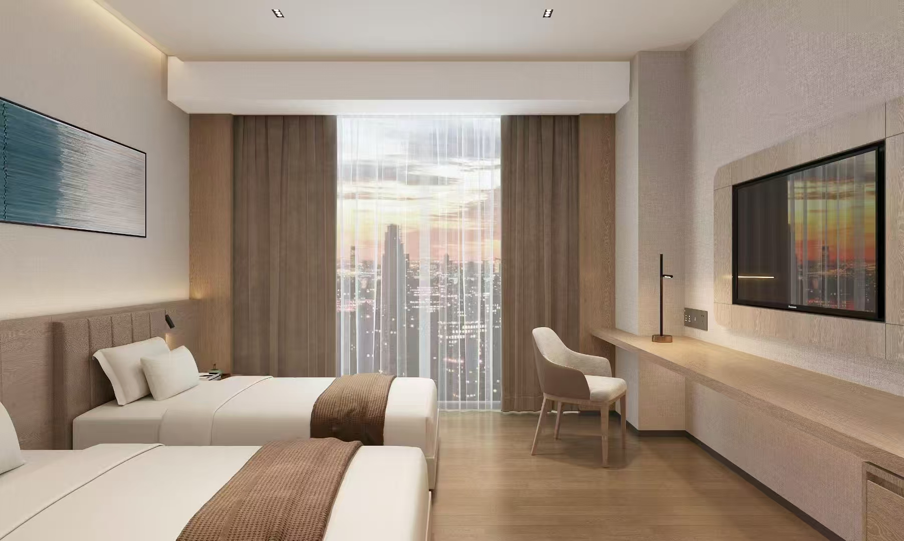 五至十一层为客房区域,依“莲动下渔舟”之意打造,致力于传递自然静谧与轻松惬意。126间客房类型丰富,包括舒适大床房、舒适双床房、智能大床房、高级双床房、好莱坞房及豪华套房,满足商务差旅与亲子度假等多元需求。同层还设有健身房和自助洗衣房,助力宾客畅享便捷出行。