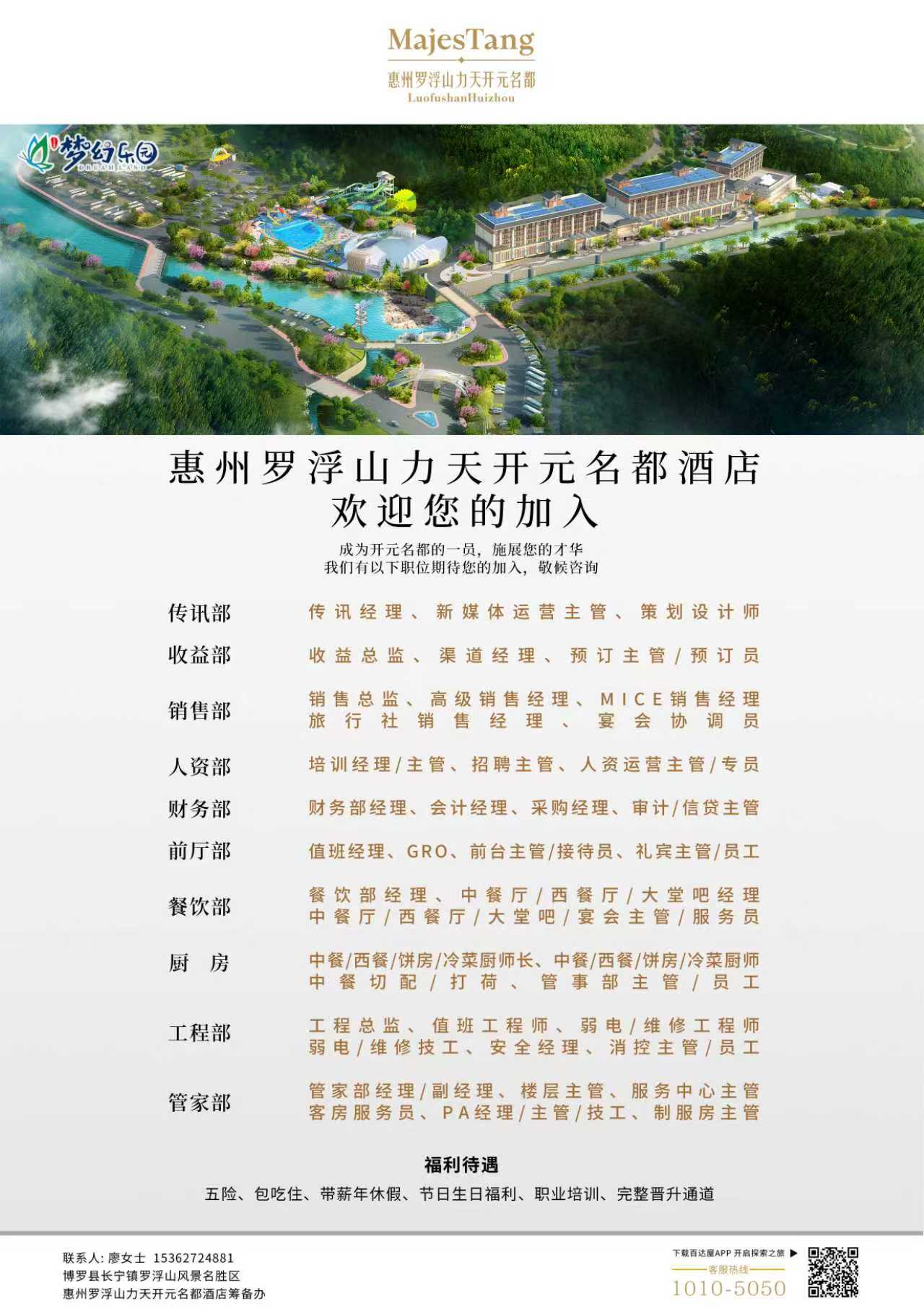 惠州罗浮山力天开元名都酒店坐落于国家5A级罗浮山风景区旁,由惠州力天梦幻城旅游开发公司投资5亿多元打造,委托德胧集团运营管理,总经营面积约2.8万平方米。酒店以“自然山水+高端住宿+全龄游乐”为特色,配套自营管理梦幻乐园、云梦山顶探险乐园和云梦谷御泉,是一处集休闲度假、亲子游乐与商务会议于一体的综合型度假目的地。