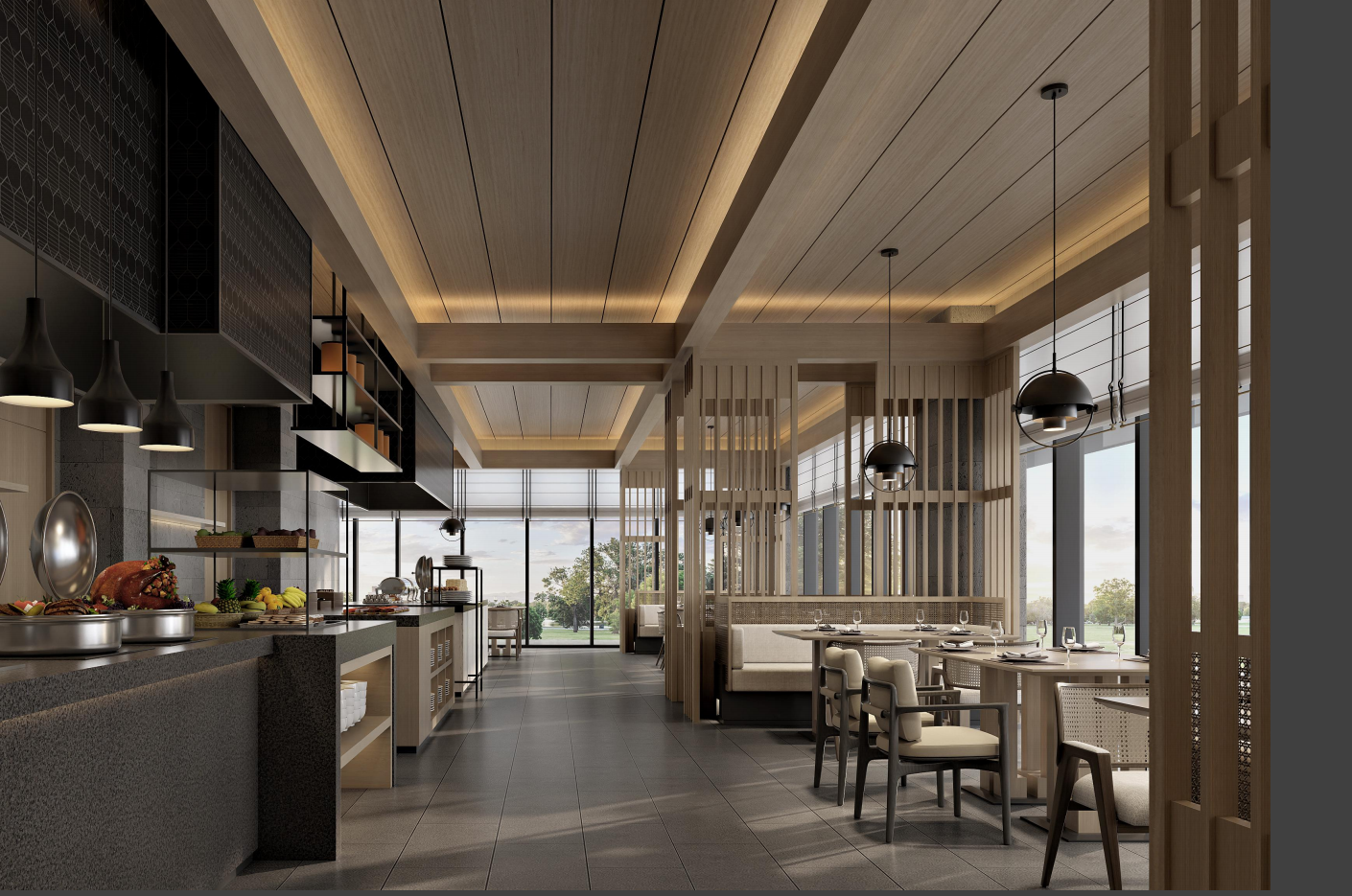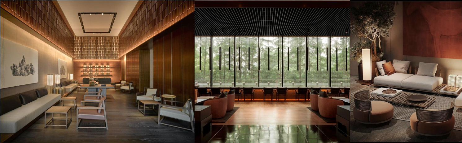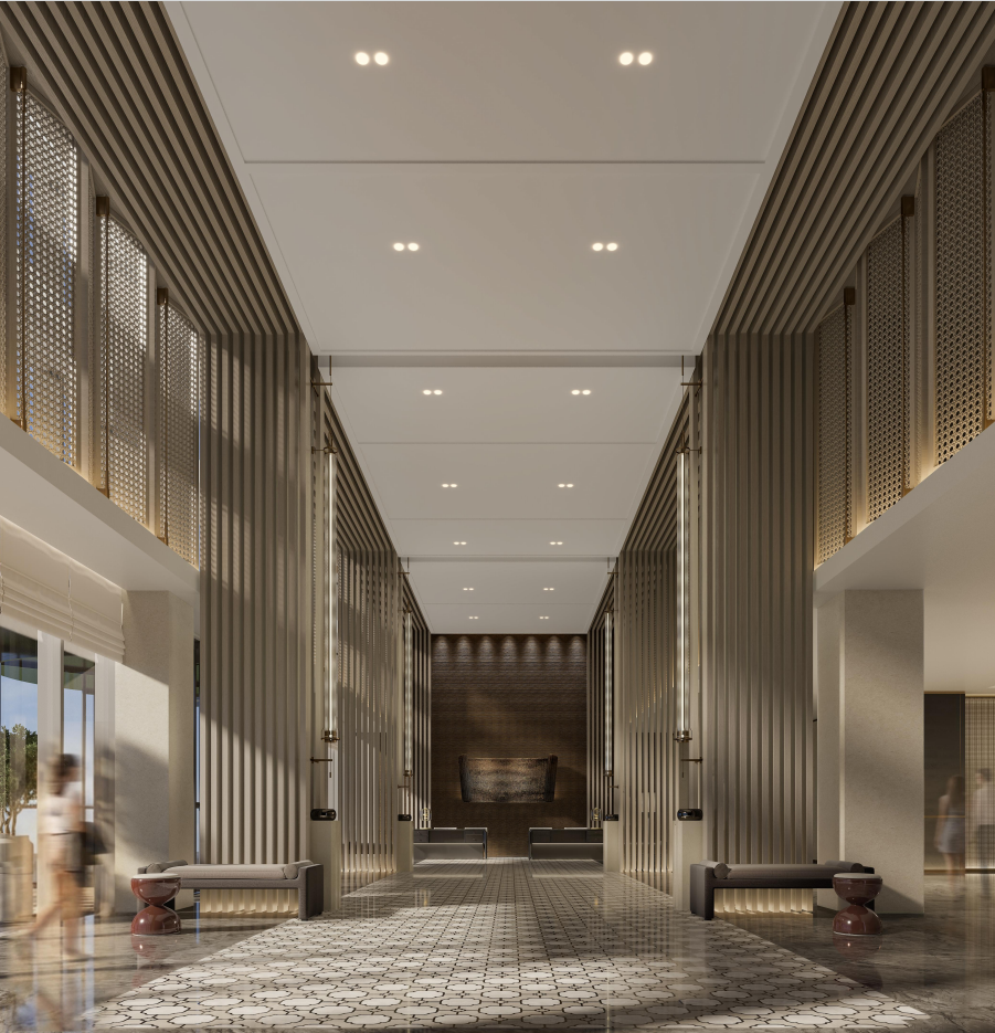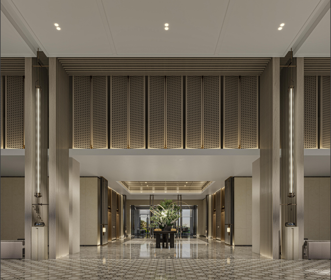 衢州万达美华轻尚酒店作为万达旗下超中端品牌,聚焦年轻化、多元化消费需求,以 “山为骨、棋为魂” 为设计核心,将衢州烂柯山隐逸哲学与围棋智慧融入现代空间。酒店地理位置优越,依托城市便捷交通网络,周边文旅配套完善,是年轻商旅与休闲宾客的理想之选。酒店共设 336 间特色客房,设计巧思独具:床背景摹刻烂柯山天生石梁,迷你吧源自围棋罐提篮,卷轴式洗手镜蕴含儒学思想,棋盘格地毯延展空间韵律,在虚实之间演绎时空叠合的东方意境。公区规划借鉴围棋棋盘格律,黑白交织的地砖与天花网格遥相呼应,共享服务岛台兼具接待、咖啡茶饮等多重功能,主题连廊以《烂柯图》画卷串联,松柏造型艺术装置投射光影涟漪,营造静谧雅致的共享社交氛围。酒店配套完善的健身房与自助洗衣房,外摆区结合绿植造景形成半开放 “棋局观景台”,既满足社交需求,又保障宾客便捷舒适的入住体验。